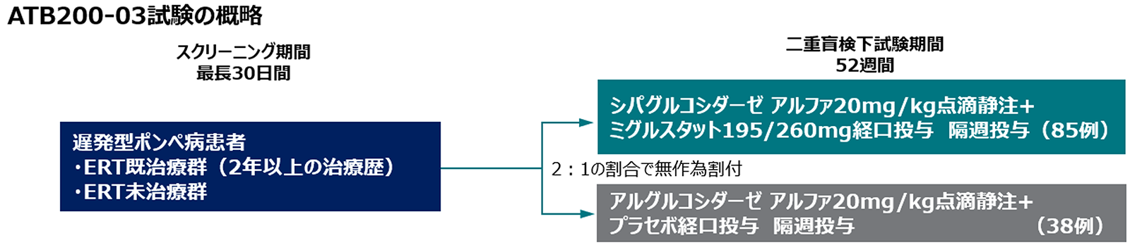 30日間のスクリーニング期間が設定され、ERT治療歴(ERT既治療又はERT未治療)及びベースライン時の6分間歩行距離のカテゴリー(75m以上150m未満、150m以上400m未満又は400m以上)で層別した上で、ポムビリティとオプフォルダ併用又はアルグルコシダーゼ アルファとプラセボ併用のいずれかに2:1の割合で無作為に割り付け、52週間隔週で投与