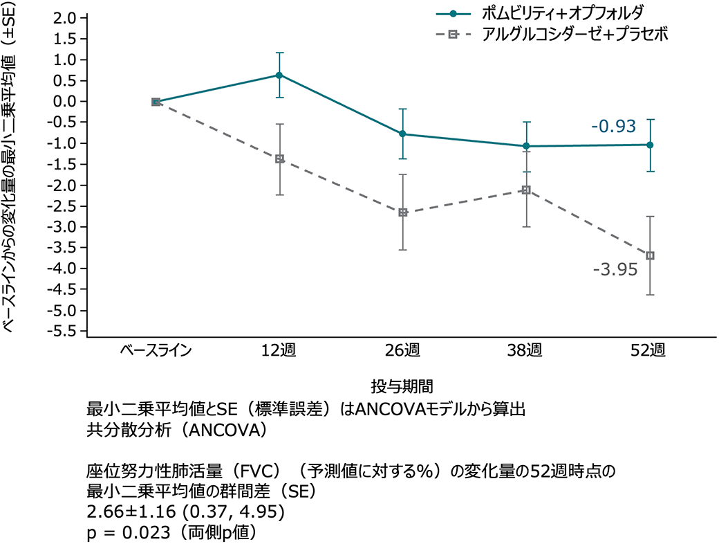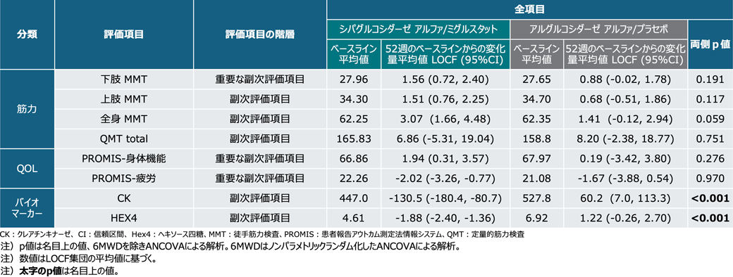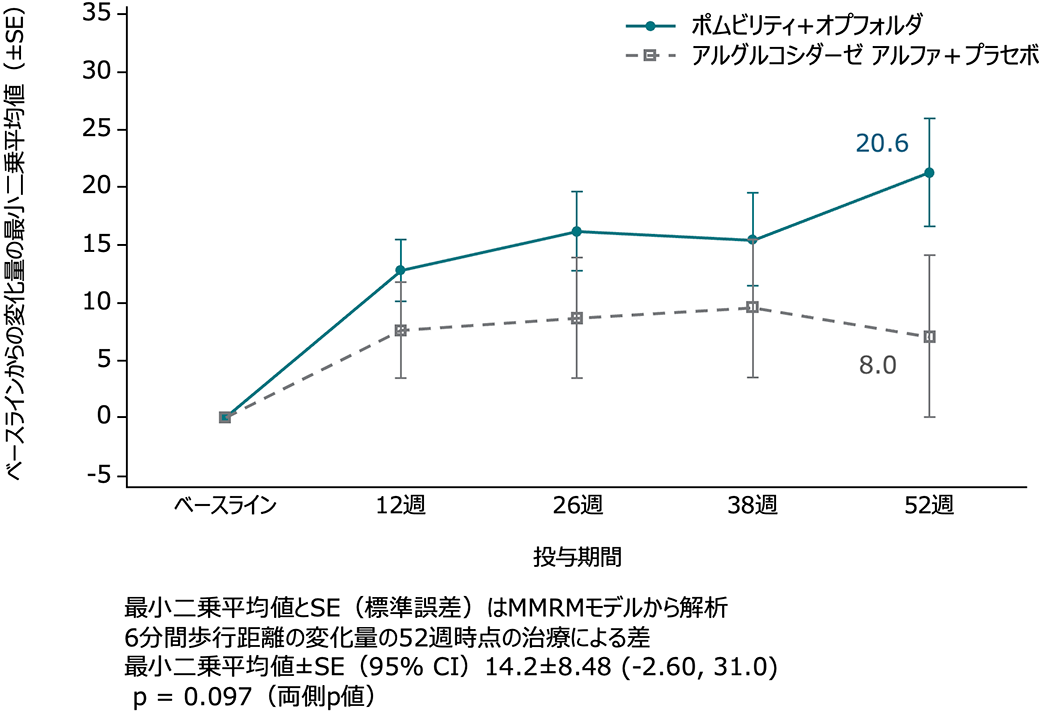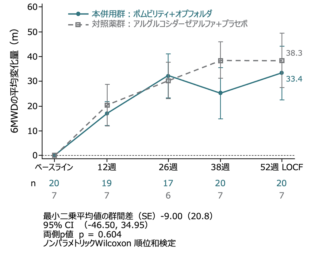 有効性の主解析は、有効性の主要評価項目を本併用群と対照薬群の間で、片側有意水準0.025で群間比較することにより実施した。ITT-OBS集団を対象に、有効性の主要評価項目(6MWDの52週でのベースラインからの変化量)を反復測定混合効果モデル(MMRM)により解析し、本併用群とアルグルコシダーゼ アルファ/プラセボ群を比較した。各時点で最小二乗平均値、SE、最小二乗平均値の投与群間差、及び95%CIを推定した。また、解析順序をつけた6つの重要な副次評価項目を設定した。最初に主要評価項目の検定を有意水準0.025で実施し、有意であれば、順位付けした重要な副次評価項目も同様に有意水準0.025で座位努力性肺活量(座位FVC)(予測値に対する%)の52 週でのベースラインからの変化量、徒手筋力検査(MMT) 下肢スコアの52週でのベースラインからの変化量、6MWD(m)の26週でのベースラインからの変化量、PROMIS(身体機能)合計スコアの52週でのベースラインからの変化量、PROMIS(疲労)合計スコアの52週でのベースラインからの変化量、GSGC 合計スコアの52週でのベースラインからの変化量の順に検定を行った。重要な副次評価項目の統計学的有意性は、それぞれ片側有意水準0.025で検定順序に従って解釈した。いずれかの段階で帰無仮説が棄却されなかった場合、それ以降の比較検定は優越性に関して統計学的に有意であると判定しないものとした。重要な副次評価項目は、ITT-LOCF集団を対象に、それぞれANCOVAを用いて解析した。ANCOVAの推定値(各投与群の最小二乗平均値、最小二乗平均値の差、推定値のSE、最小二乗平均値の差の95%CI、及び2群間の比較についてのp値)を示した。